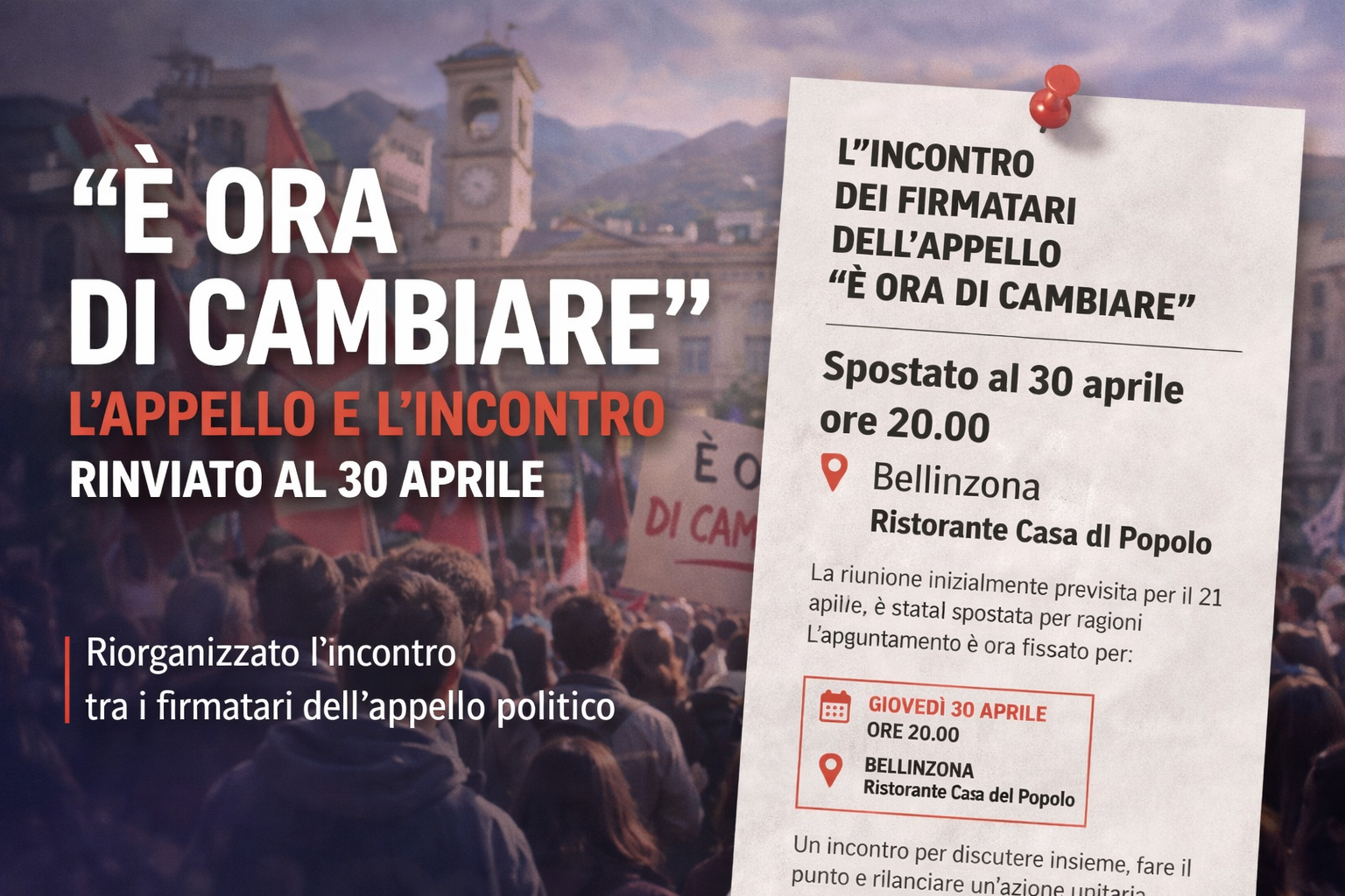 L’appuntamento, inizialmente previsto per il 21 aprile, è stato posticipato per ragioni organizzative e si terrà ora giovedì 30 aprile alle ore 20.00 presso il Ristorante Casa del Popolo a Bellinzona.